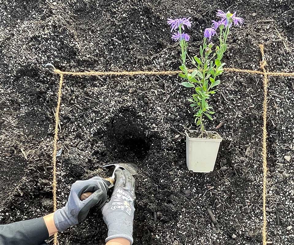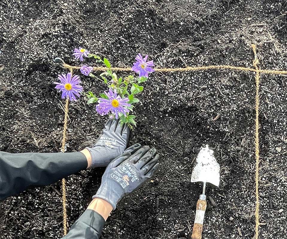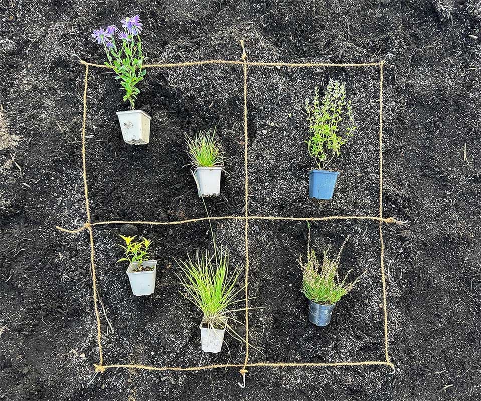 Ordne deine Pflanzen in jedem Quadrat dem Bepflanzungsplan folgend und der empfohlenen Dichte entsprechend an. Verteile sie im Quadrat nach Zufallsprinzip, aber achte bitte darauf, zwischen jeder Pflanze und dem Rand des Quadrats etwas Platz zu lassen.