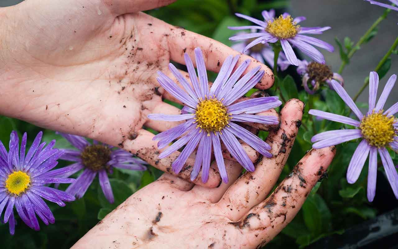 Mehrere Exemplare der Aster amellus ,King George‘ werden in der Eden-Project-Edition in die Erde gesetzt. Foto: © Steve Tanner.