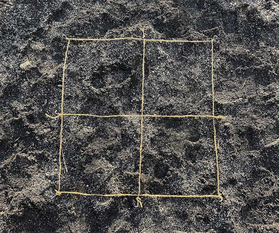 Stecke die Länge und Breite deines gesamten Areals mit Hilfe einer Schnur und Pflöcken ab. Dann teile die Fläche in 0,5 x 0,5 Meter große Quadrate auf.