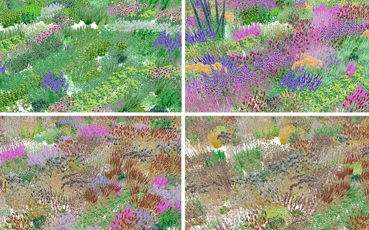 Digital renderings of the Eden Project Edition, in spring, summer, autumn, and winter (details).