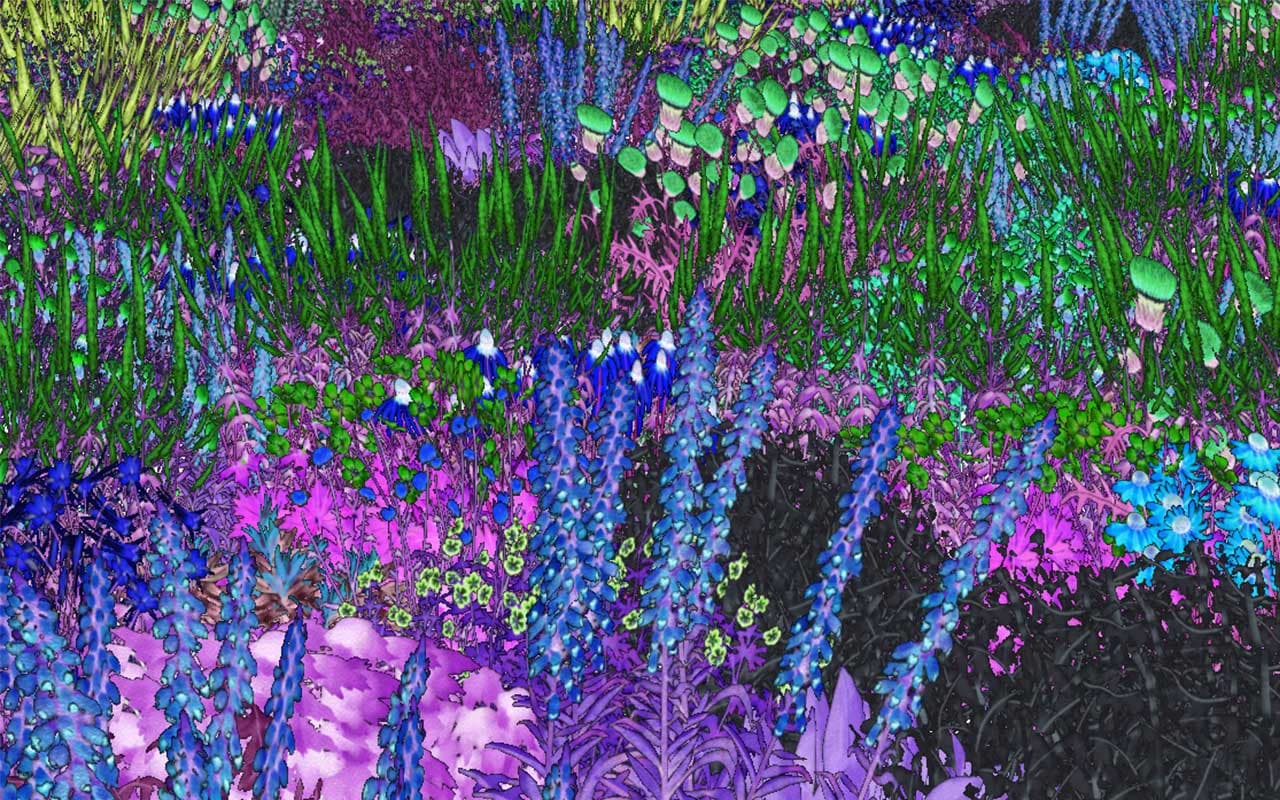 Digital rendering of a Pollinator Pathmaker garden, seen through the ‘pollinator vision’ filter.