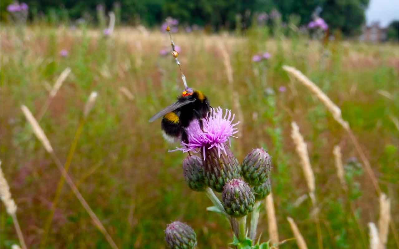A bumblebee fitted with a transponder for tracking its flightpath. Photo: © Lars Chittka.