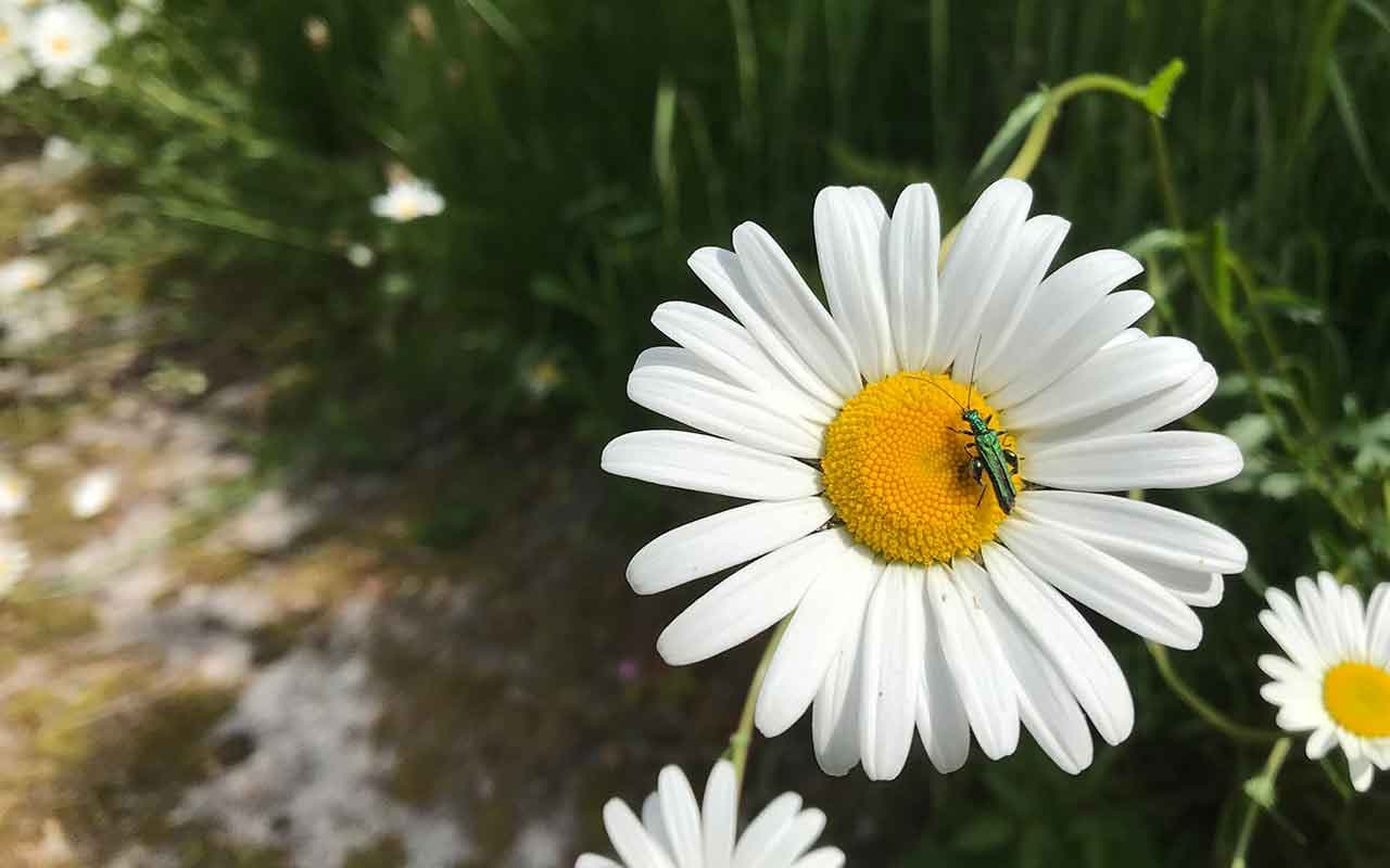 A swollen-thighed beetle (Oedemera nobilis) on an oxeye daisy (Leucanthemum vulgare) at the Eden Project. Photo: © Nathan Mansbridge.